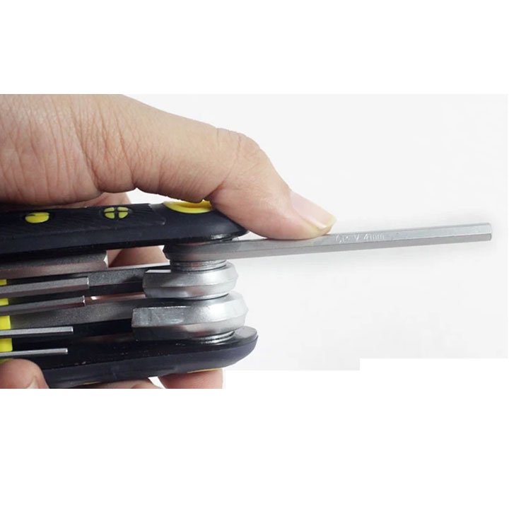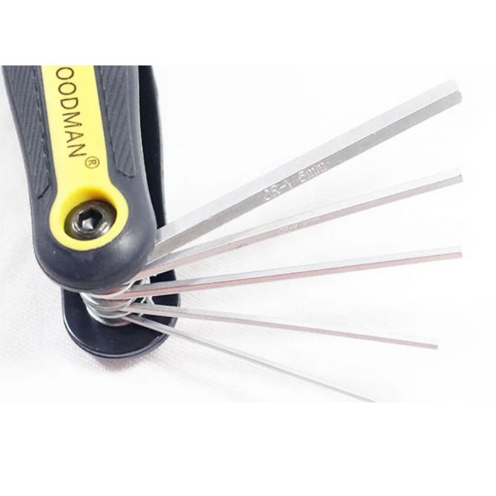 Bộ Lục Lăng Goodman Gập 8 Chi Tiết (USA) là bộ lục giác gập đơn giản mà gọn gàng. Bộ lục giác gập Goodman có 8 đầu thông dụng vặn vừa hết các loại vít và bu lông giác chìm thông dụng, kể cả giác chìm ở xe đạp. Bộ giạc giác gập Goodman có các trục lục giác bằng hợp kim không rỉ và bền, chuôi là cau su có gân chống trơn giúp gia tăng lực vặn rất tốt.