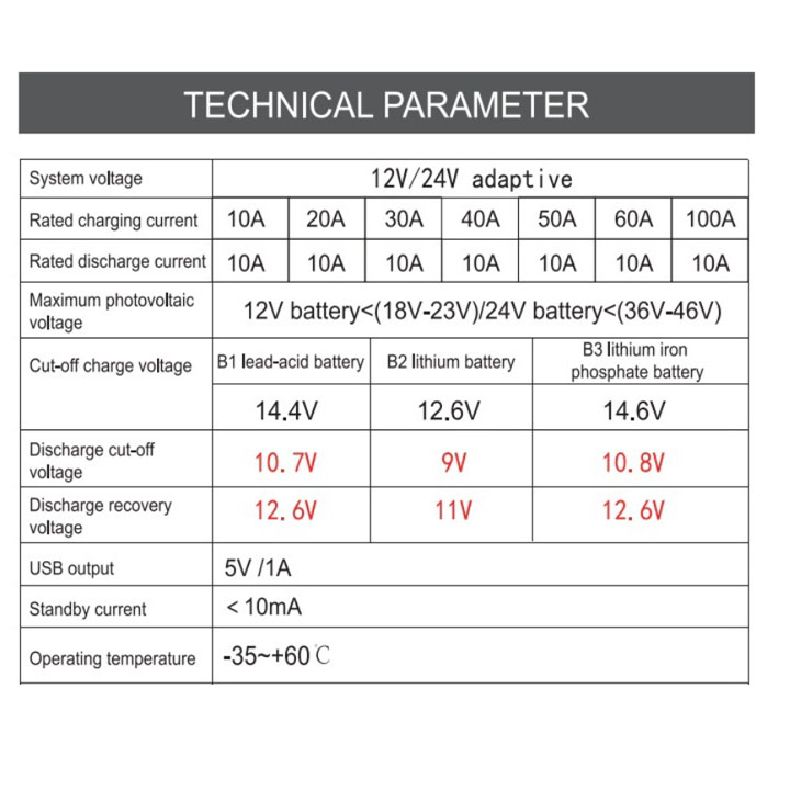 ➤ Bộ điều khiển chỉ thích hợp cho ắc quy axit chì (B01), Lithium ion (B02), LiFePO4 (B03).