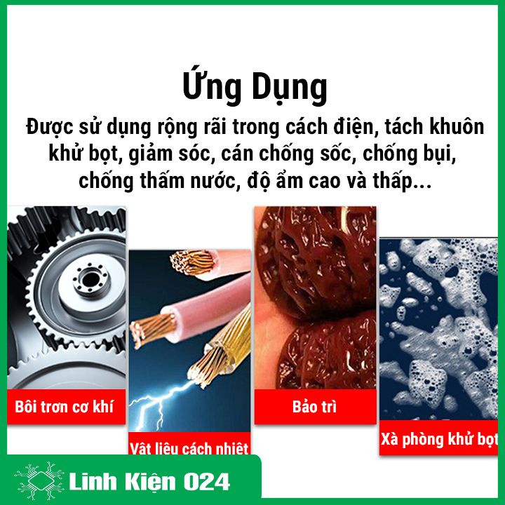 ✔️Ứng dụng: sử dụng trong cách điện, tách khuôn khử bọt, giảm sóc, cán chống sốc, chống bụi, chống thấm nước…