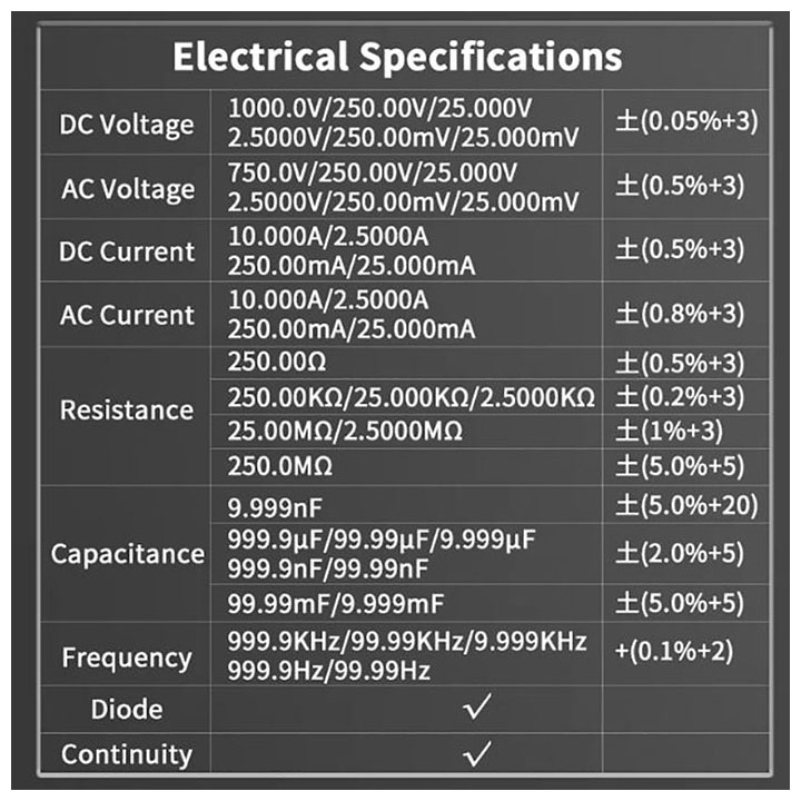 ➤ CHỨC NĂNG ĐO ĐA NĂNG NÂNG CAO – Đo RMS thực, điện áp & dòng điện AC/DC, điện trở, điện dung, kiểm tra tần số với độ phân giải màn hình 25.000 số và khả năng tự động điều chỉnh phạm vi