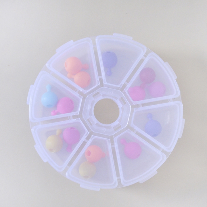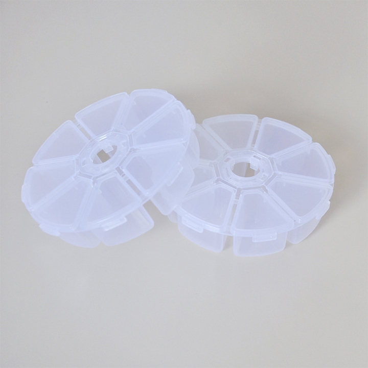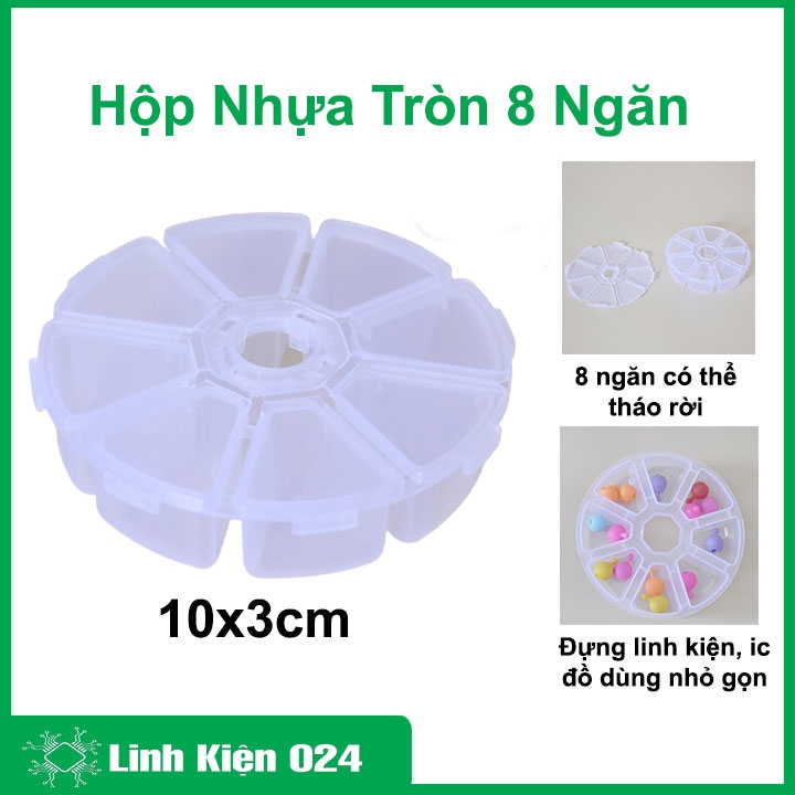 Hộp nhựa tròn 8 ngăn 10x3cm là dụng cụ chia đồ nhỏ, giúp sắp xếp linh kiện hoặc phụ kiện gọn gàng, tiện lợi và bền, thường thấy trong ngành điện tử và thủ công mỹ nghệ