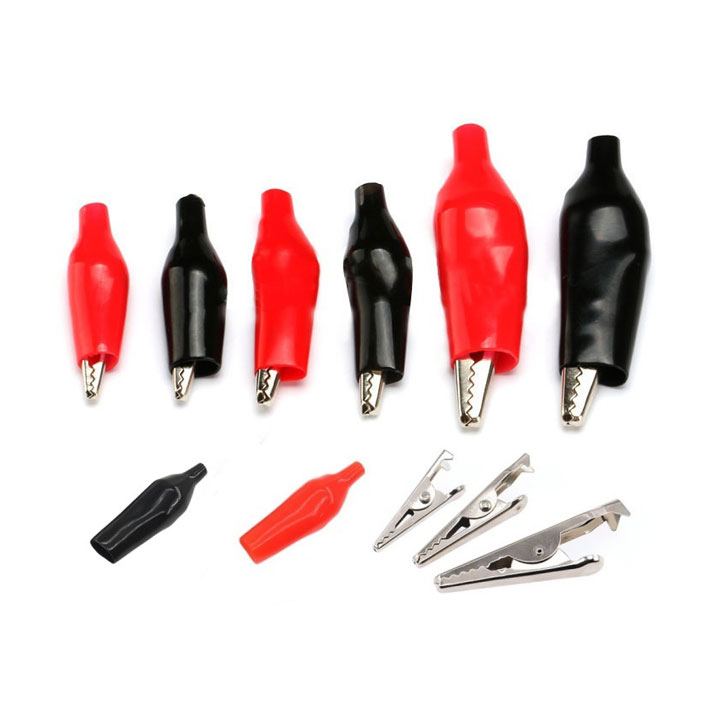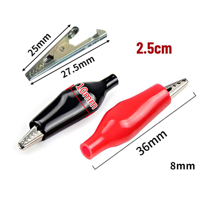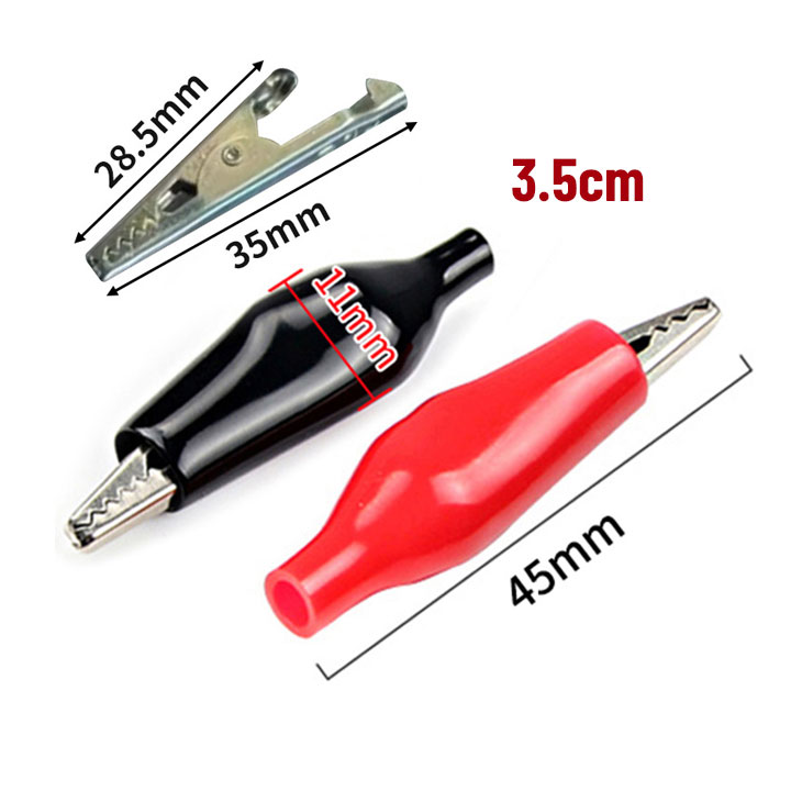 Kẹp Cá Sấu loại nhỏ, với kích thước chiều dài lần lượt là 2.5cm, 3.5cm, và 4.5cm – đây là các loại kẹp thử điện rất phổ biến trong điện tử và DIY