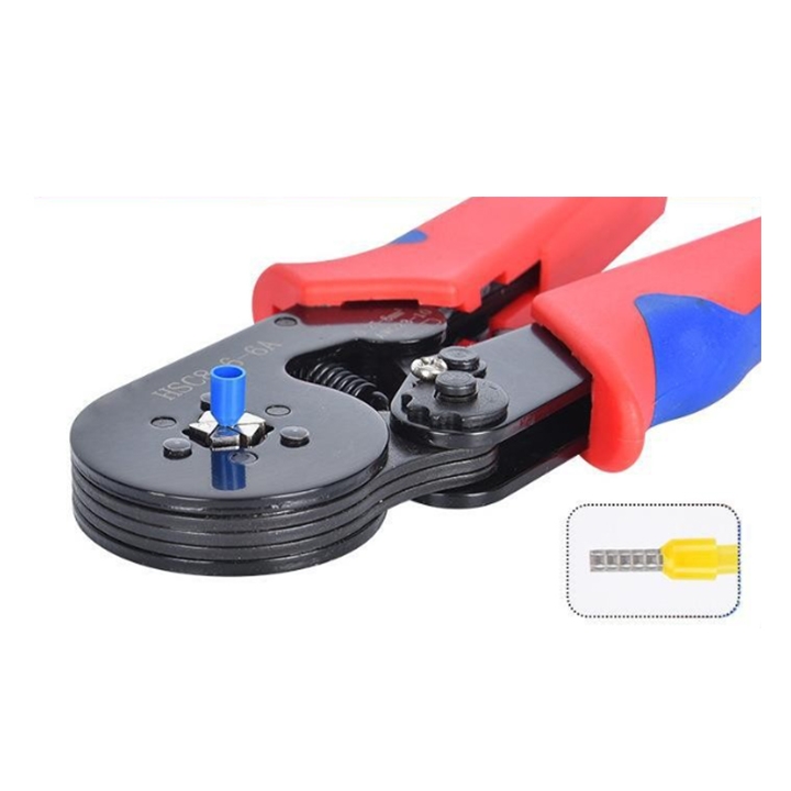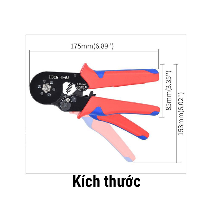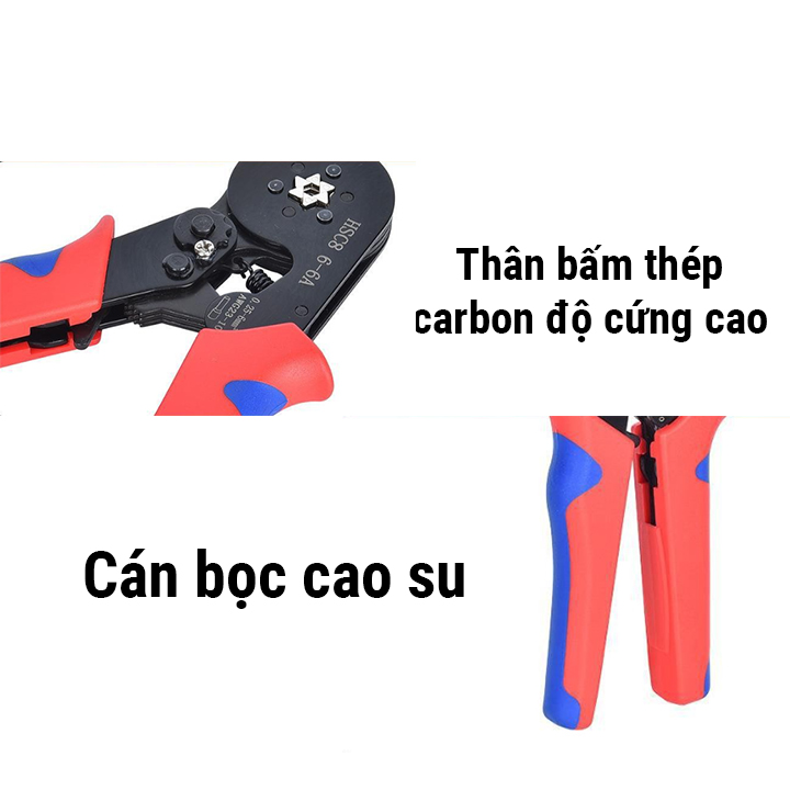 Kìm bấm cos lục giác HSC8 6-6A là loại kìm chuyên dụng để bấm đầu cốt điện (ferrule) có tiết diện dây từ 0.25mm² đến 6mm². Đây là loại kìm tự điều chỉnh, nghĩa là khi đưa đầu cos vào, kìm sẽ tự động căn chỉnh kích thước để bấm chặt mà không cần thay khuôn.