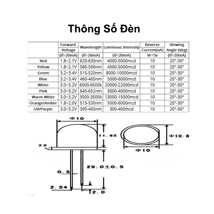 Kích thước | Đường kính đầu LED là 10mm (lớn hơn loại phổ biến 5mm) |