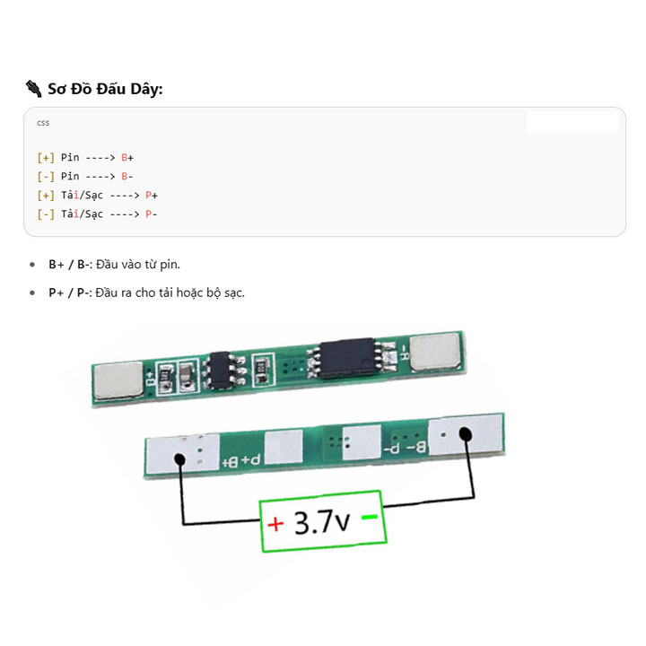 ✔️ P- : kết nối dương nguồn (mạch sạc pin)/ dương tải (thiết bị)