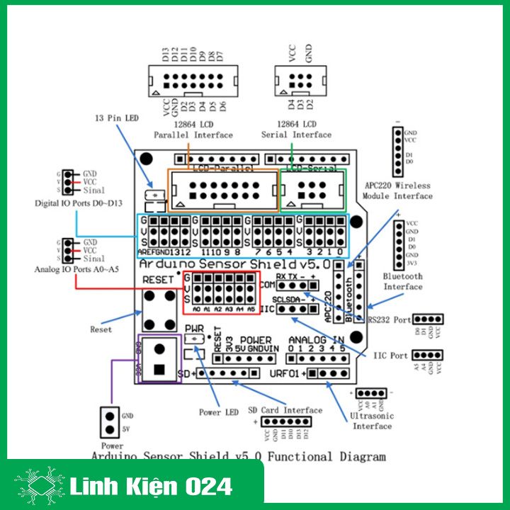 ✔️ Các cổng kết nối trên Arduino Sensor Shield bao gồm: